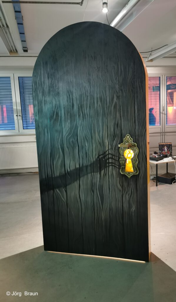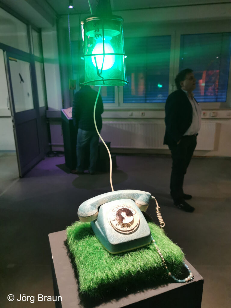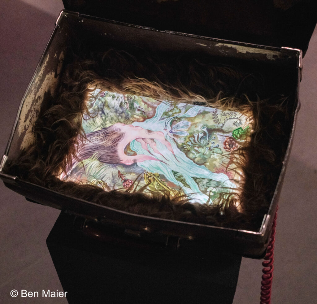 From the very entrance of the exhibition, visitors are immersed in a dreamlike atmosphere inspired by cinematic sets. A path unfolds through various “stations,” allowing each visitor to construct their own story by assembling the narrative clues presented. Each object is interactive, creating a tangible connection with the work. Interactions vary in complexity: pressing a phone to hear a story, opening a suitcase to reveal an animated image, or interacting with a mirror that uses facial recognition.